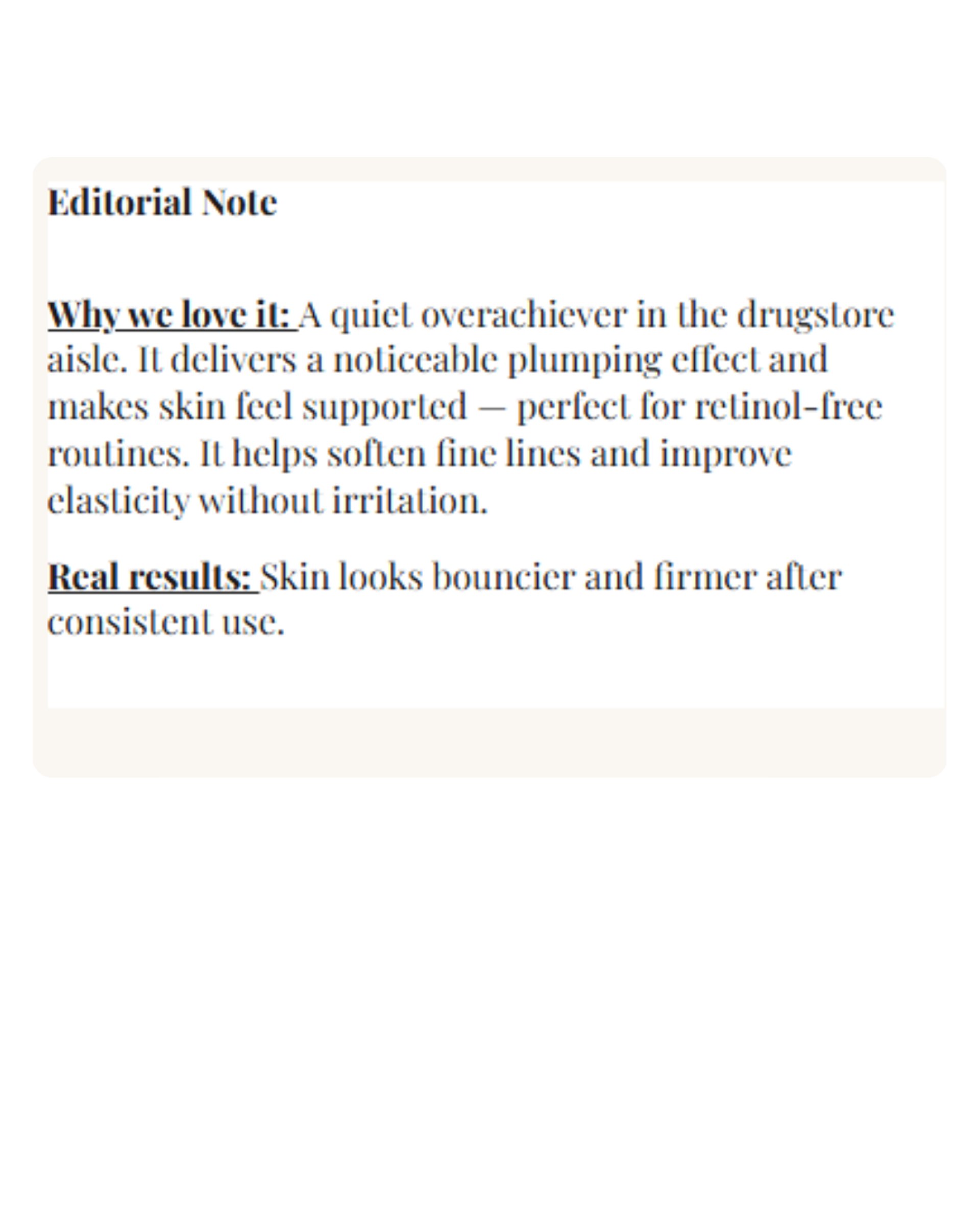 Why we love it: A quiet overachiever in the drugstore aisle. It delivers a noticeable plumping effect and makes skin feel supported — perfect for retinol-free routines. It helps soften fine lines and improve elasticity without irritation.