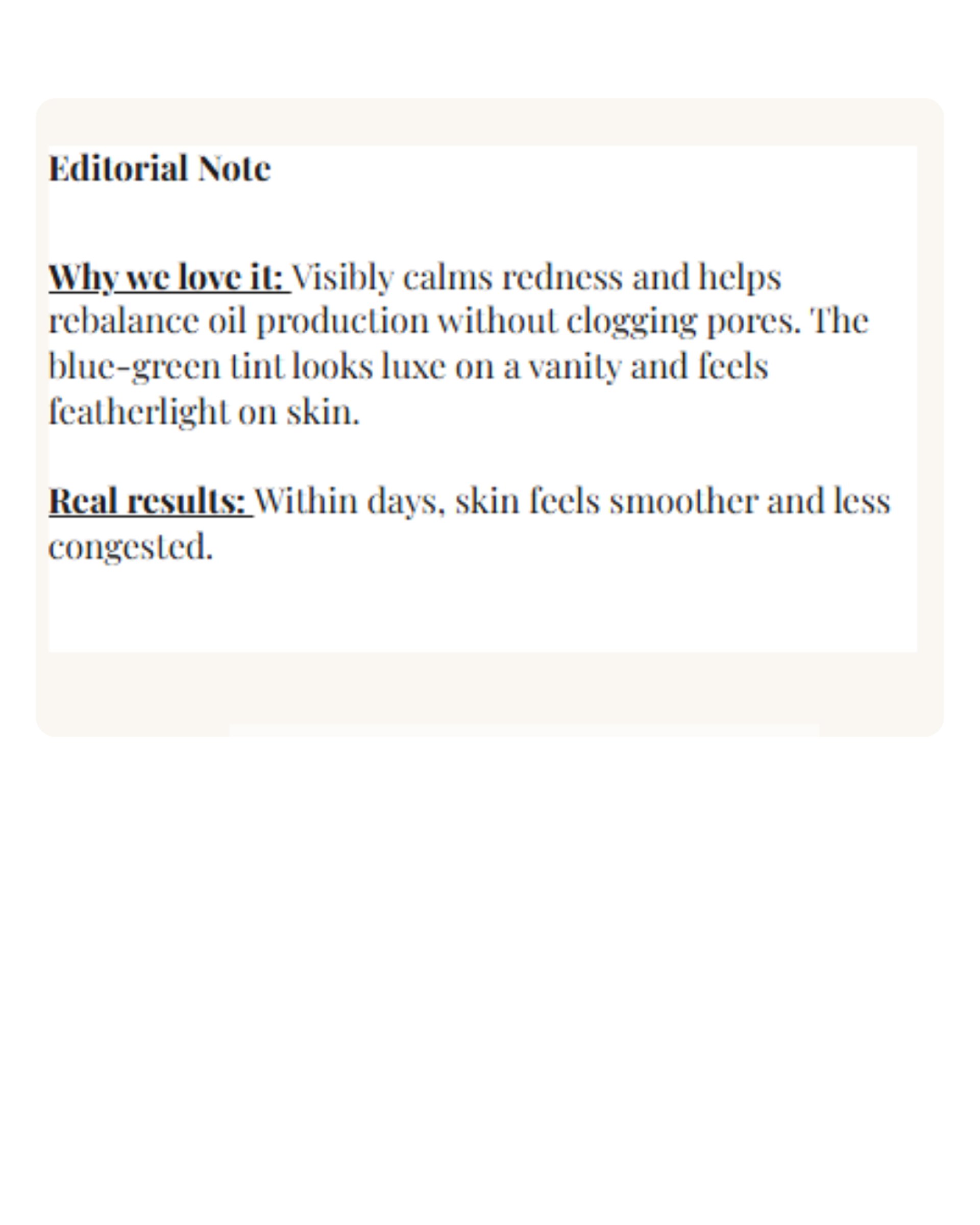 Why we love it: Visibly calms redness and helps rebalance oil production without clogging pores. The blue-green tint looks luxe on a vanity and feels featherlight on skin.
