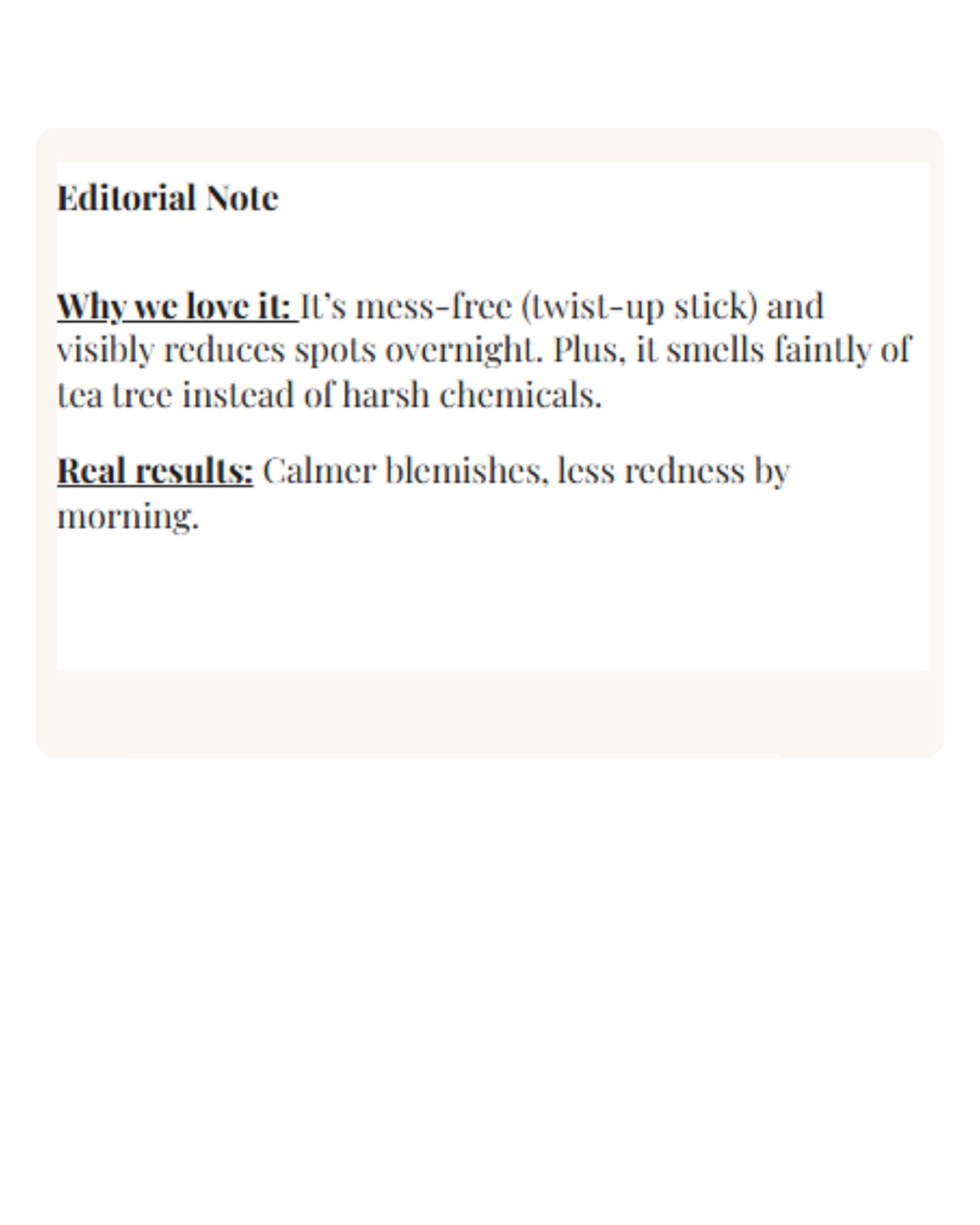 Why we love it: It’s mess-free (twist-up stick) and visibly reduces spots overnight. Plus, it smells faintly of tea tree instead of harsh chemicals.