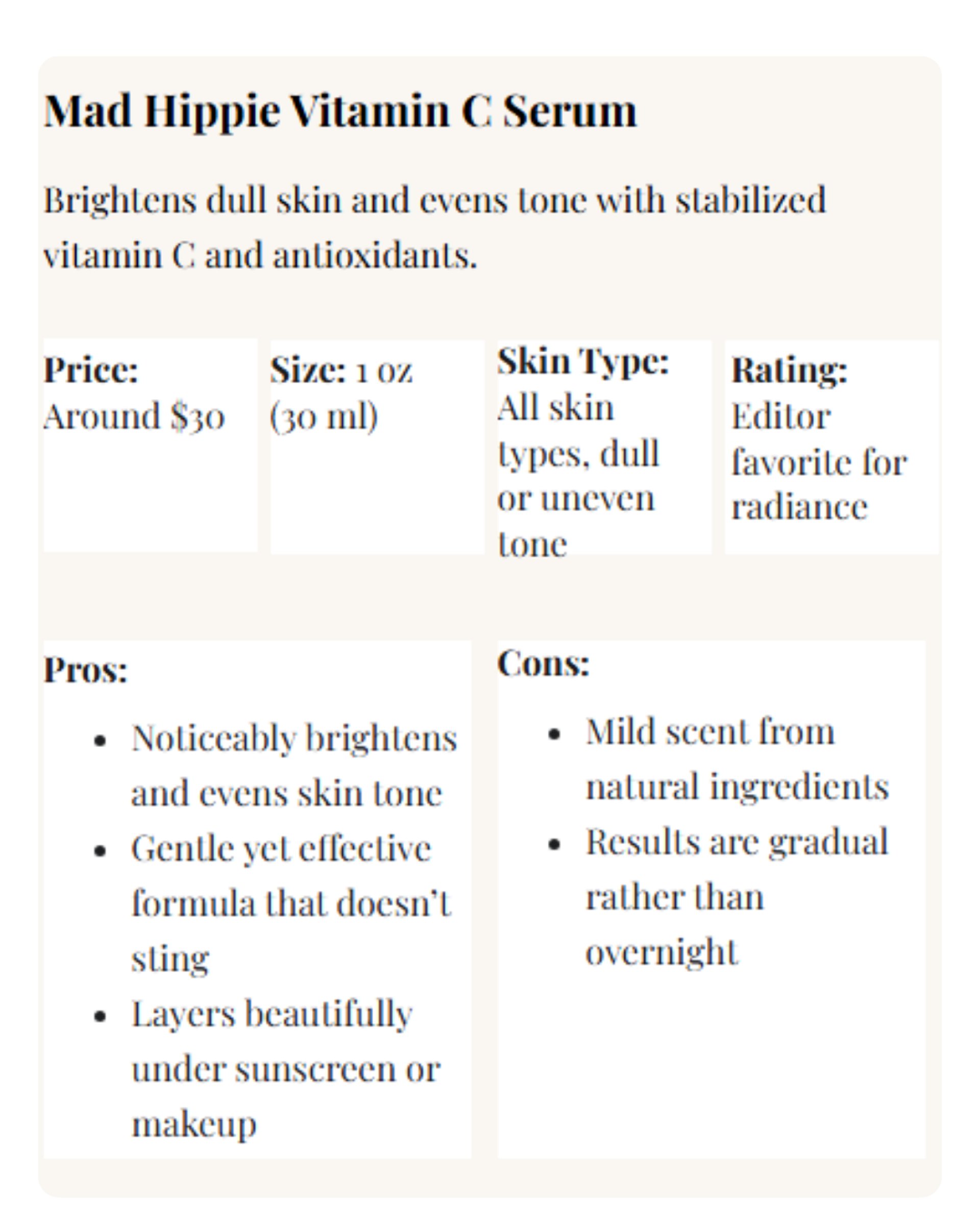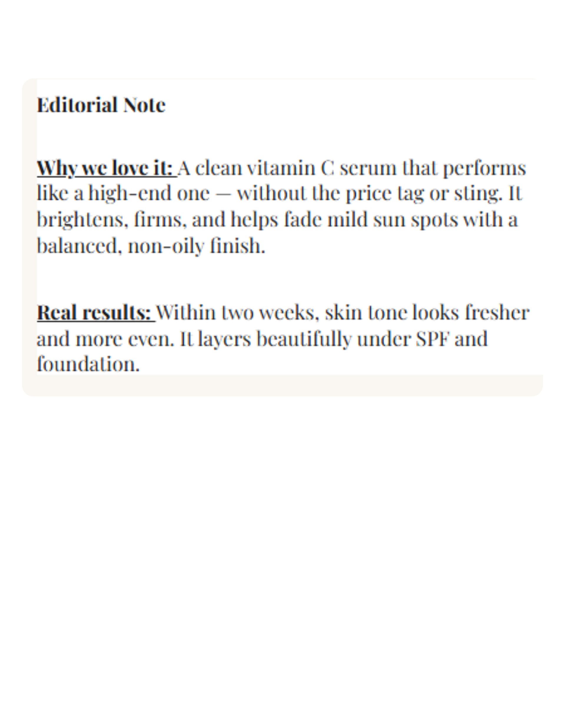 Why we love it: A clean vitamin C serum that performs like a high-end one — without the price tag or sting. It brightens, firms, and helps fade mild sun spots with a balanced, non-oily finish.