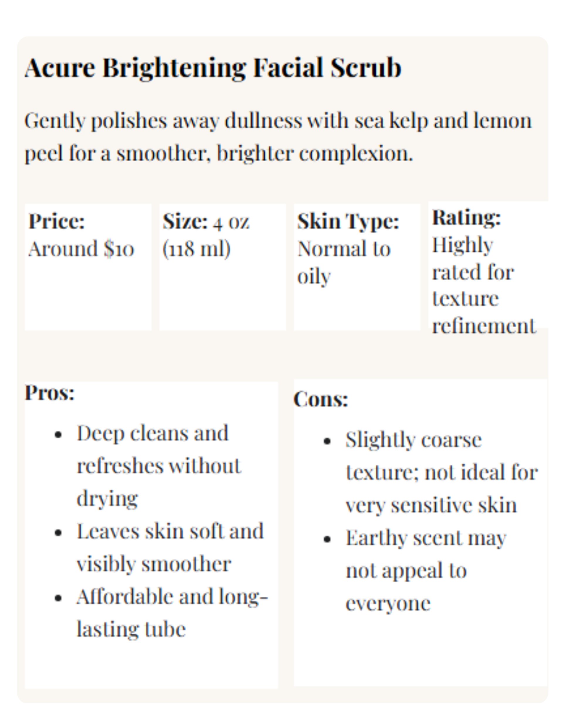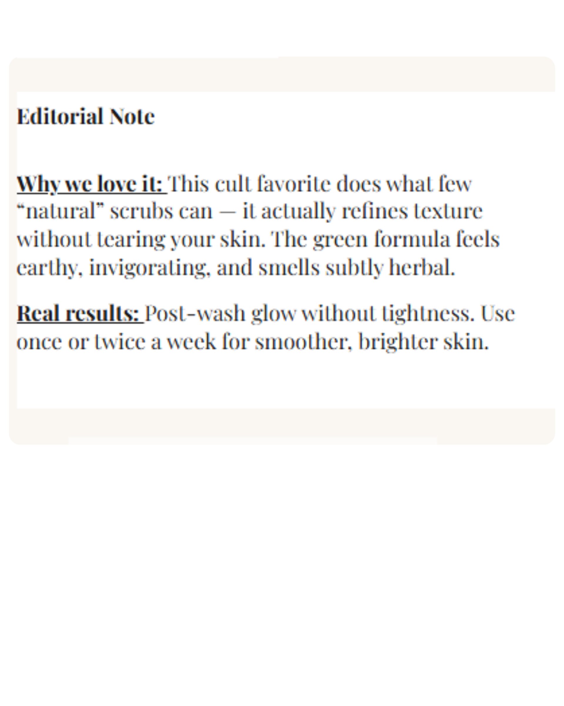 Why we love it: This cult favorite does what few “natural” scrubs can — it actually refines texture without tearing your skin. The green formula feels earthy, invigorating, and smells subtly herbal.