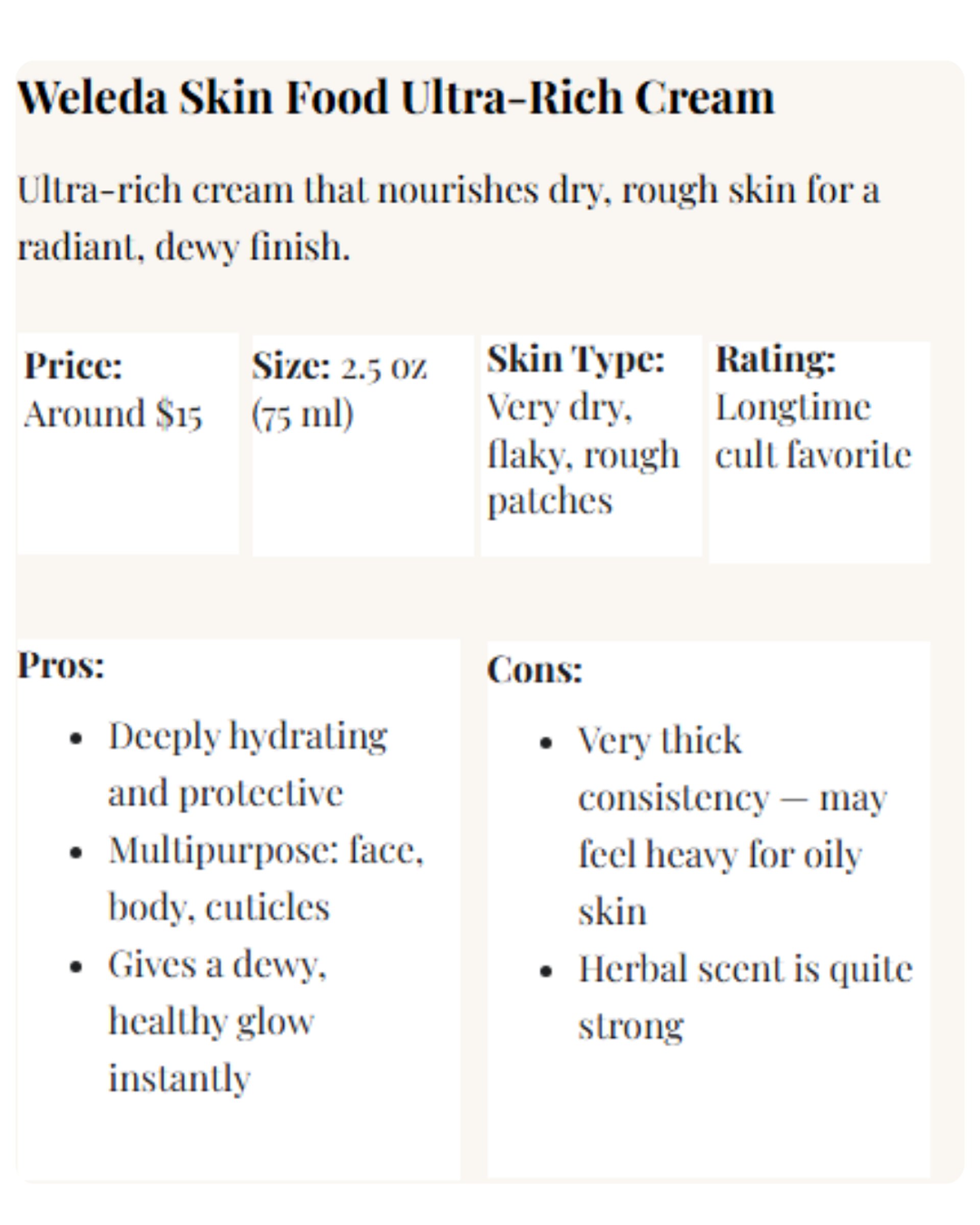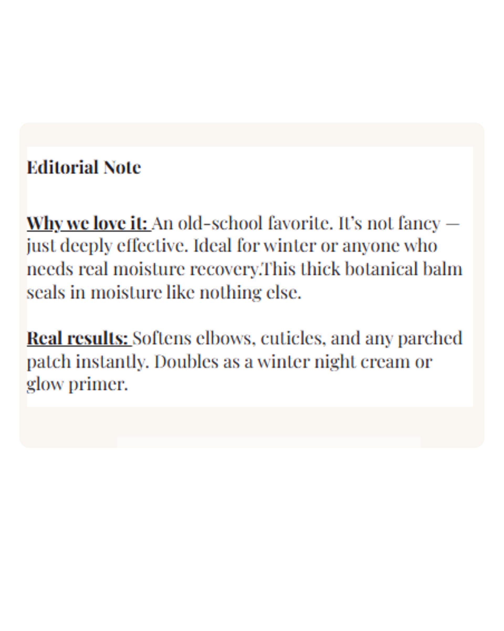 Why we love it: An old-school favorite. It’s not fancy — just deeply effective. Ideal for winter or anyone who needs real moisture recovery.This thick botanical balm seals in moisture like nothing else.