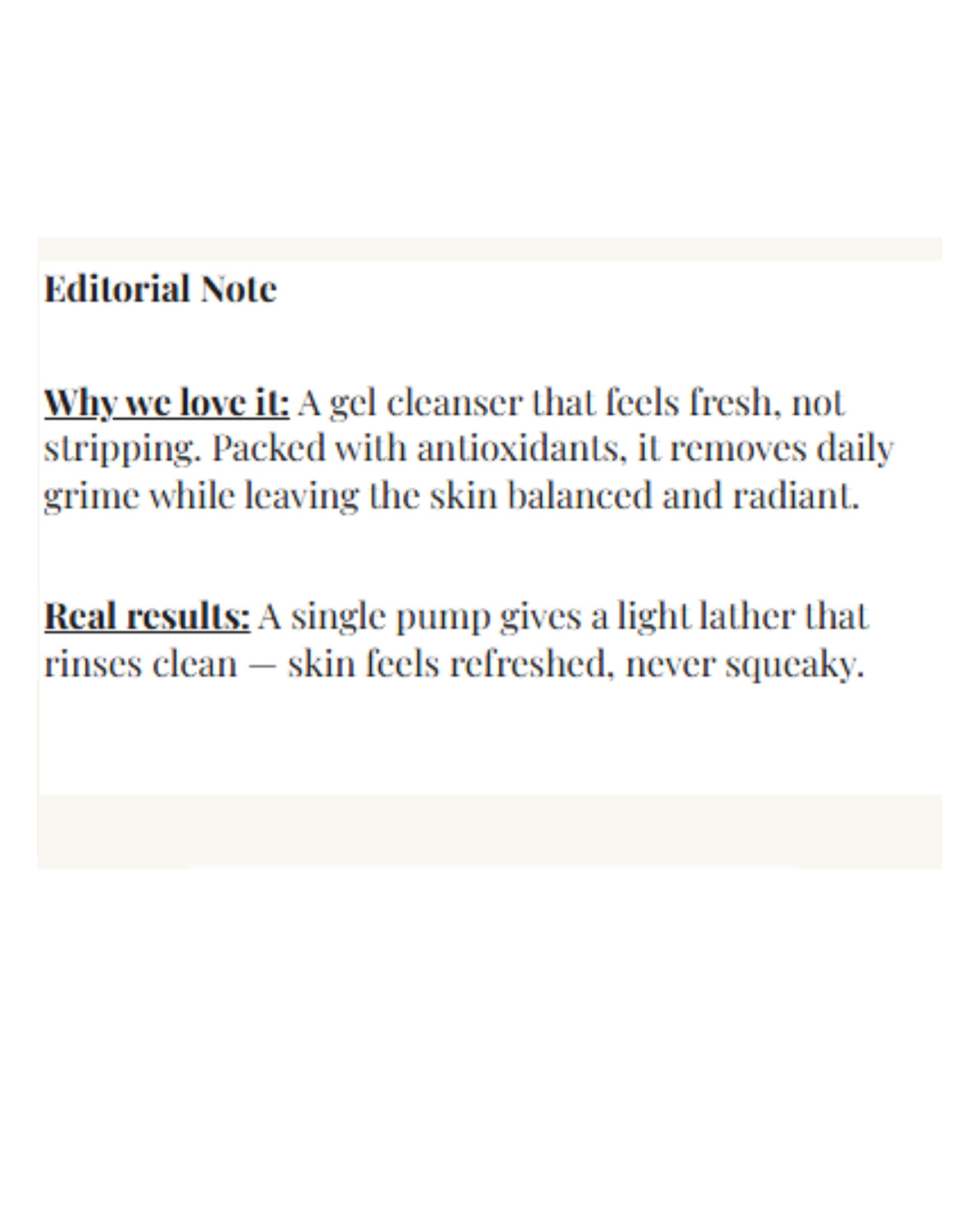 Why we love it: A gel cleanser that feels fresh, not stripping. Packed with antioxidants, it removes daily grime while leaving the skin balanced and radiant.